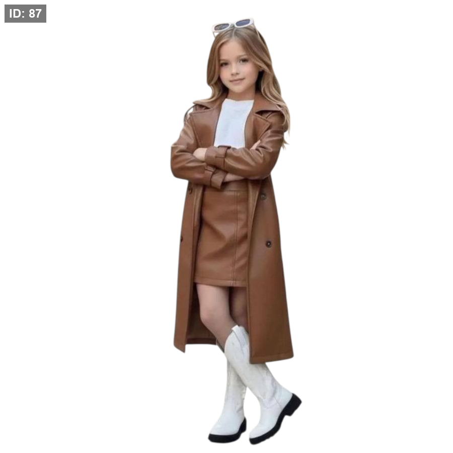 ترانشكوت جلد مع تنورة جلد وبلوزة وحقيبة